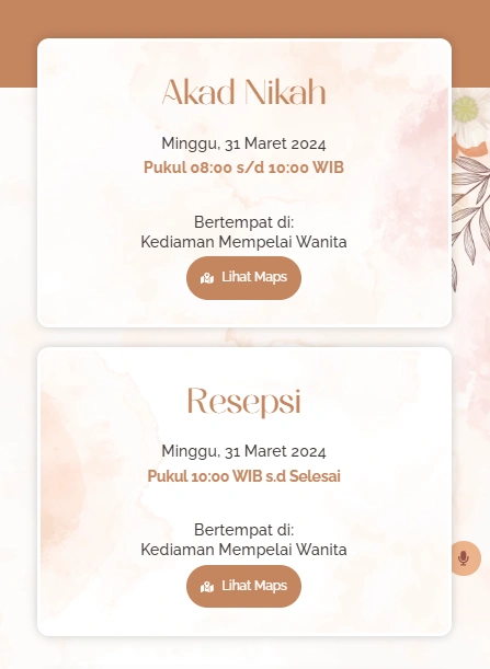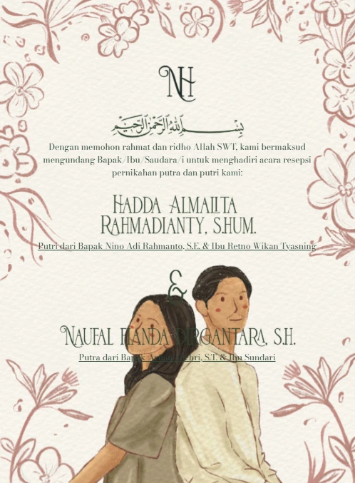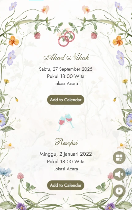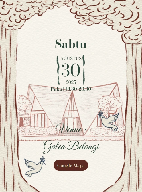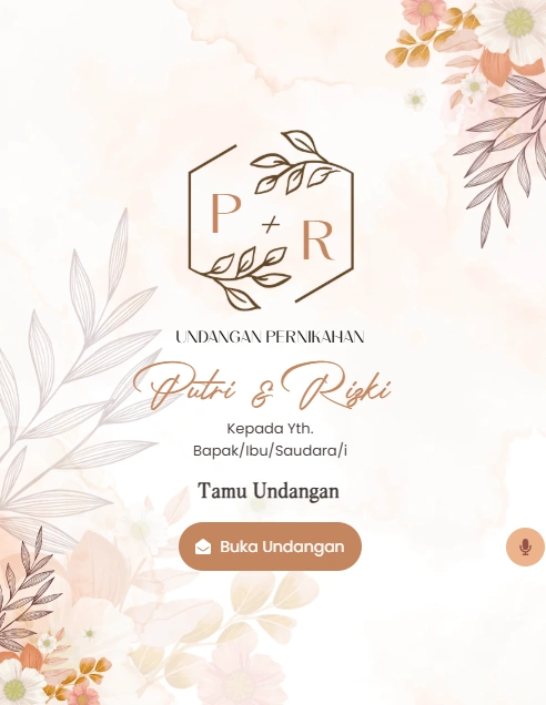 Jika Anda menyukai konsep natural dan earthy, tema undangan digital rustic adalah pilihan yang sempurna. Warna cokelat, beige, khaki, dan krem berpadu apik dengan elemen bunga-bunga yang artistik.