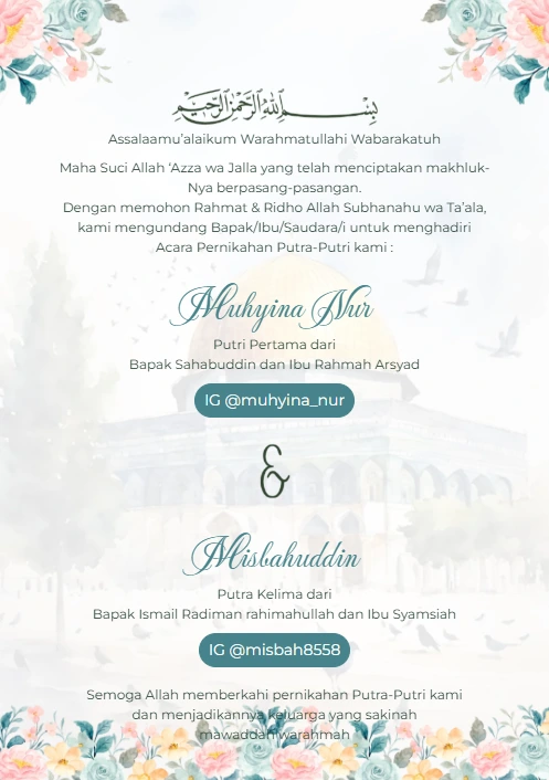 Undangan tema islami menjadi salah satu pilihan tema undangan modern yang cukup populer. Biasanya undangan ini dipilih calon mempelai yang tidak ingin menampilkan wajah atau foto pasangan. Jadi sesuai syariat Islam dan lengkap dengan ornamen serta ayat, hadis, atau kutipan islami.